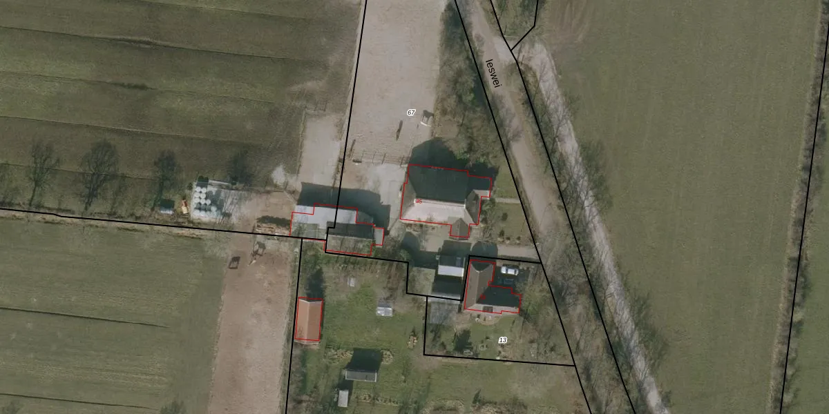 Het perceel waarop Ieswei 35 staat heeft een oppervlakte van 2480 m². Dit is een zeer groot perceel. De perceeloppervlakte wordt geregistreerd door het Kadaster. Gedetailleerde informatie over de maten van dit perceel kunt u vinden in het rapport Kadastrale kaart met maatvoering van Ieswei 35.