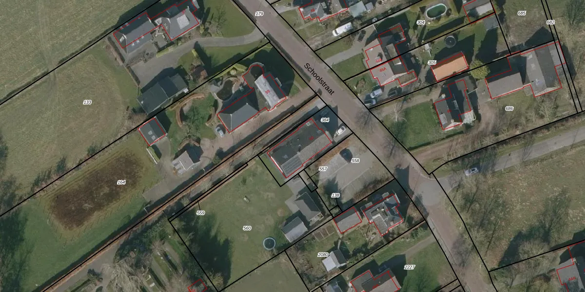 Het perceel waarop Schoolstraat 53 staat heeft een oppervlakte van 400 m². Dit is een groot perceel. De perceeloppervlakte wordt geregistreerd door het Kadaster. Gedetailleerde informatie over de maten van dit perceel kunt u vinden in het rapport Kadastrale kaart met maatvoering van Schoolstraat 53.