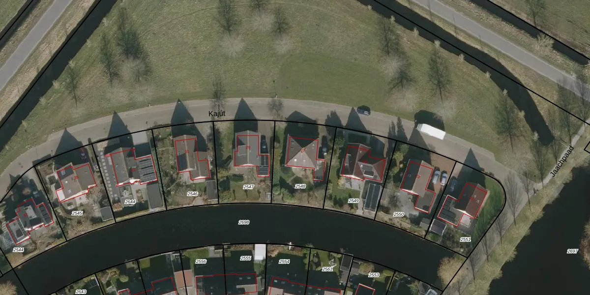 Het perceel waarop Kajút 27 staat heeft een oppervlakte van 545 m². Dit is een groot perceel. De perceeloppervlakte wordt geregistreerd door het Kadaster. Gedetailleerde informatie over de maten van dit perceel kunt u vinden in het rapport Kadastrale kaart met maatvoering van Kajút 27.