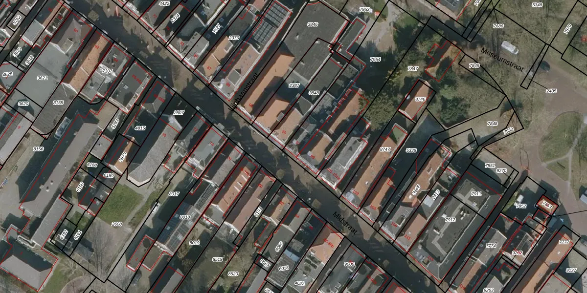 Het perceel waarop Midstraat 97 staat heeft een oppervlakte van 960 m². Dit is een groot perceel. De perceeloppervlakte wordt geregistreerd door het Kadaster. Gedetailleerde informatie over de maten van dit perceel kunt u vinden in het rapport Kadastrale kaart met maatvoering van Midstraat 97.