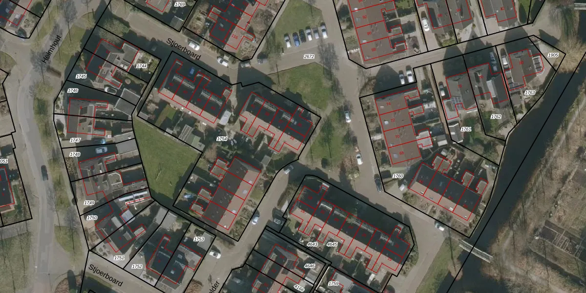 Het perceel waarop Stjoerboard 33 staat heeft een oppervlakte van 2013 m². Dit is een zeer groot perceel. De perceeloppervlakte wordt geregistreerd door het Kadaster. Gedetailleerde informatie over de maten van dit perceel kunt u vinden in het rapport Kadastrale kaart met maatvoering van Stjoerboard 33.