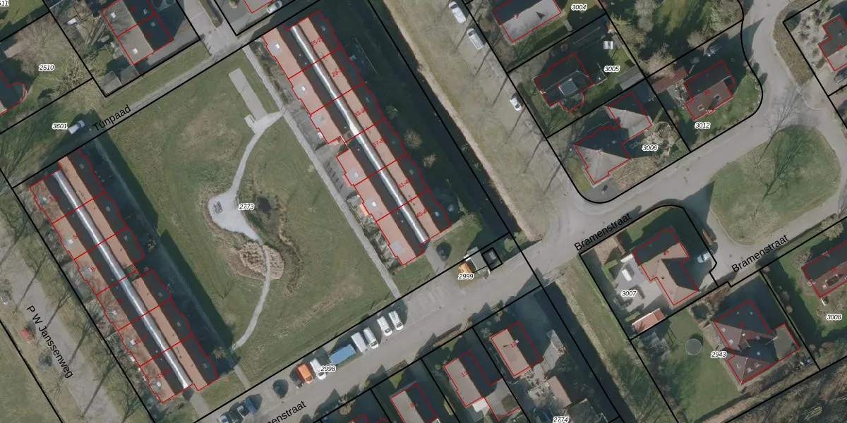 Het perceel waarop Bramenstraat 45 staat heeft een oppervlakte van 6600 m². Dit is een zeer groot perceel. De perceeloppervlakte wordt geregistreerd door het Kadaster. Gedetailleerde informatie over de maten van dit perceel kunt u vinden in het rapport Kadastrale kaart met maatvoering van Bramenstraat 45.