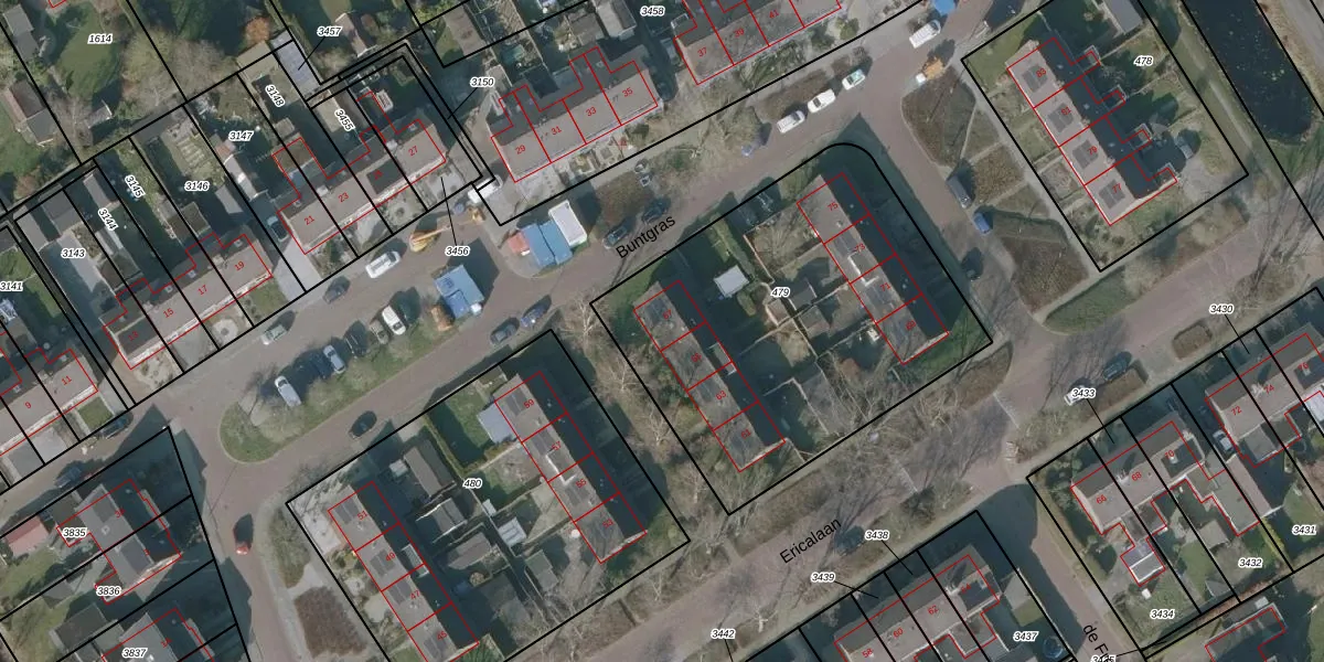 Het perceel waarop Ericalaan 67 staat heeft een oppervlakte van 1800 m². Dit is een zeer groot perceel. De perceeloppervlakte wordt geregistreerd door het Kadaster. Gedetailleerde informatie over de maten van dit perceel kunt u vinden in het rapport Kadastrale kaart met maatvoering van Ericalaan 67.