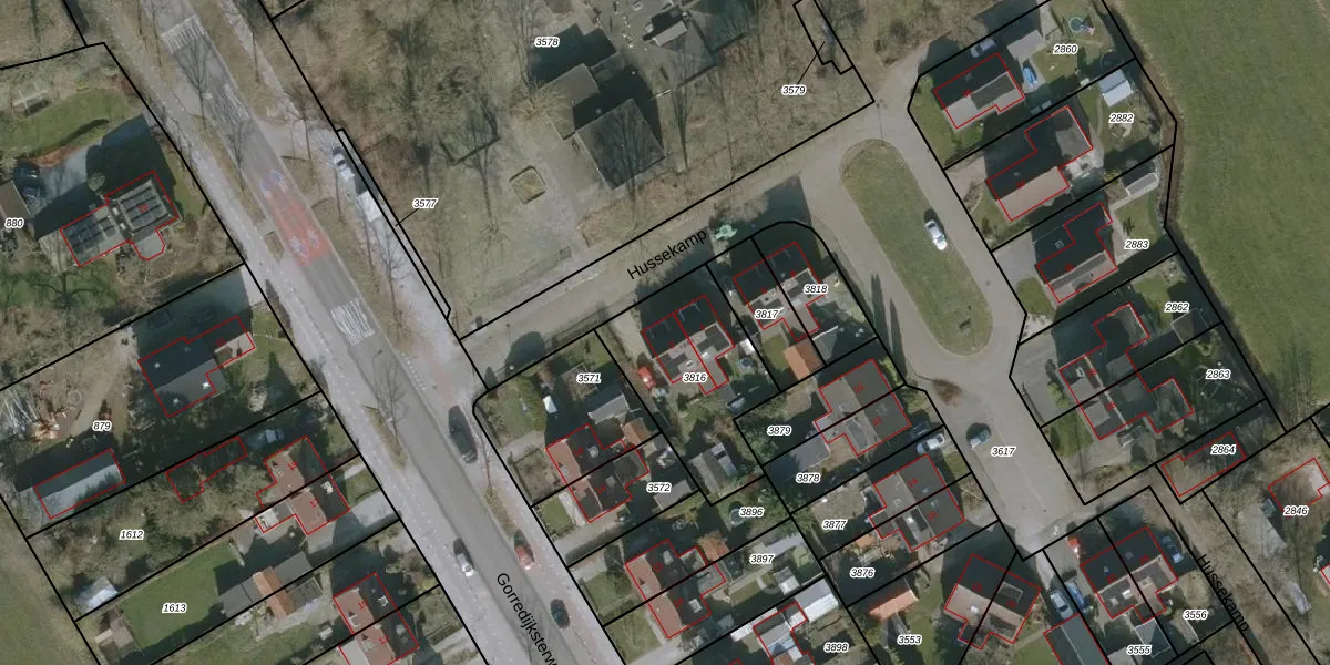 Het perceel waarop Hussekamp 2 staat heeft een oppervlakte van 519 m². Dit is een groot perceel. De perceeloppervlakte wordt geregistreerd door het Kadaster. Gedetailleerde informatie over de maten van dit perceel kunt u vinden in het rapport Kadastrale kaart met maatvoering van Hussekamp 2.