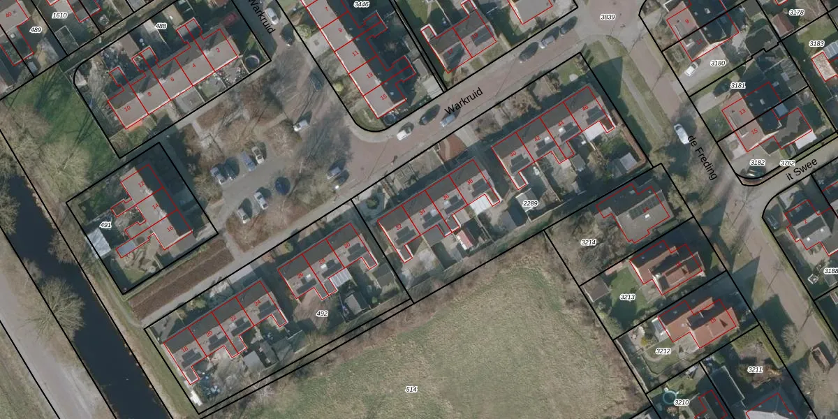 Het perceel waarop Warkruid 34 staat heeft een oppervlakte van 2040 m². Dit is een zeer groot perceel. De perceeloppervlakte wordt geregistreerd door het Kadaster. Gedetailleerde informatie over de maten van dit perceel kunt u vinden in het rapport Kadastrale kaart met maatvoering van Warkruid 34.