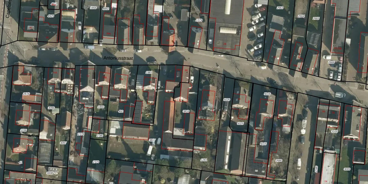 Antoniusstraat 68 is gelegen op kadastraal perceel LOO00L3816. Deze kadastrale aanduiding is uniek en wordt gebruikt door het Kadaster om eigendomsrechten en andere zakelijke rechten vast te leggen. Het perceel maakt onderdeel uit van de kadastrale gemeente Loon op Zand.