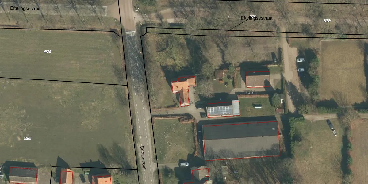 Het perceel waarop Bernsehoef 9 staat heeft een oppervlakte van 2,4 ha. Dit is een zeer groot perceel. De perceeloppervlakte wordt geregistreerd door het Kadaster. Gedetailleerde informatie over de maten van dit perceel kunt u vinden in het rapport Kadastrale kaart met maatvoering van Bernsehoef 9.