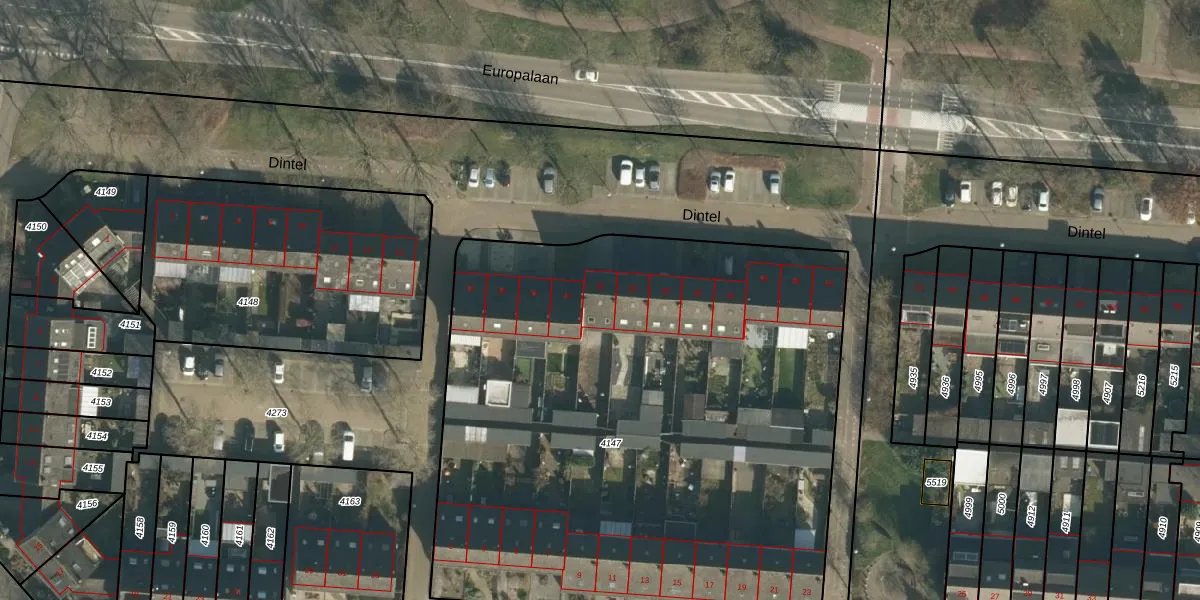 Het perceel waarop Dintel 26 staat heeft een oppervlakte van 4058 m². Dit is een zeer groot perceel. De perceeloppervlakte wordt geregistreerd door het Kadaster. Gedetailleerde informatie over de maten van dit perceel kunt u vinden in het rapport Kadastrale kaart met maatvoering van Dintel 26.
