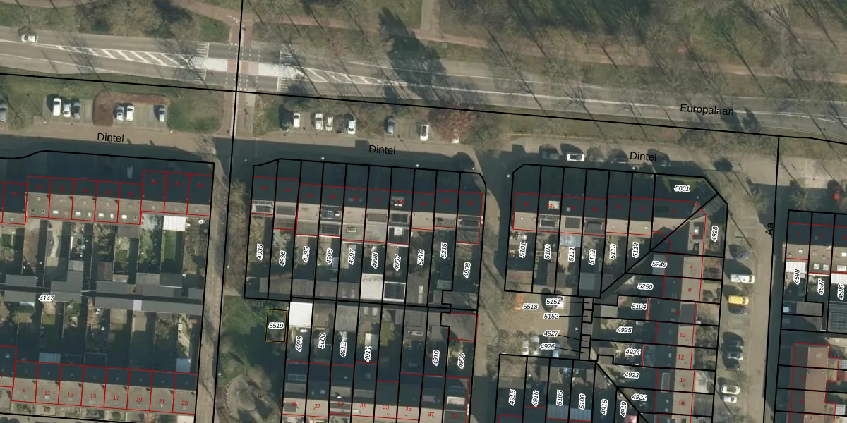 Het perceel waarop Dintel 56 staat heeft een oppervlakte van 173 m². Dit is een middelgroot perceel. De perceeloppervlakte wordt geregistreerd door het Kadaster. Gedetailleerde informatie over de maten van dit perceel kunt u vinden in het rapport Kadastrale kaart met maatvoering van Dintel 56.