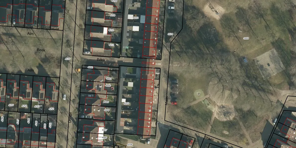 Maas 12 is gelegen op kadastraal perceel LOO00H4203. Deze kadastrale aanduiding is uniek en wordt gebruikt door het Kadaster om eigendomsrechten en andere zakelijke rechten vast te leggen. Het perceel maakt onderdeel uit van de kadastrale gemeente Loon op Zand.