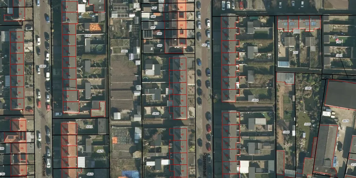 Het perceel waarop Rozenstraat 34 staat heeft een oppervlakte van 2325 m². Dit is een zeer groot perceel. De perceeloppervlakte wordt geregistreerd door het Kadaster. Gedetailleerde informatie over de maten van dit perceel kunt u vinden in het rapport Kadastrale kaart met maatvoering van Rozenstraat 34.