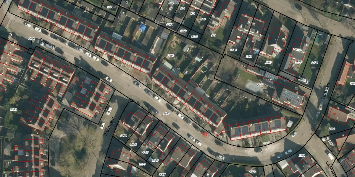 Het perceel waarop Turfvaert 33 staat heeft een oppervlakte van 4785 m². Dit is een zeer groot perceel. De perceeloppervlakte wordt geregistreerd door het Kadaster. Gedetailleerde informatie over de maten van dit perceel kunt u vinden in het rapport Kadastrale kaart met maatvoering van Turfvaert 33.