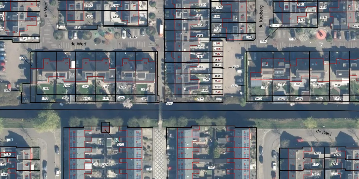 Het perceel waarop de Werf 17 staat heeft een oppervlakte van 163 m². Dit is een middelgroot perceel. De perceeloppervlakte wordt geregistreerd door het Kadaster. Gedetailleerde informatie over de maten van dit perceel kunt u vinden in het rapport Kadastrale kaart met maatvoering van de Werf 17.
