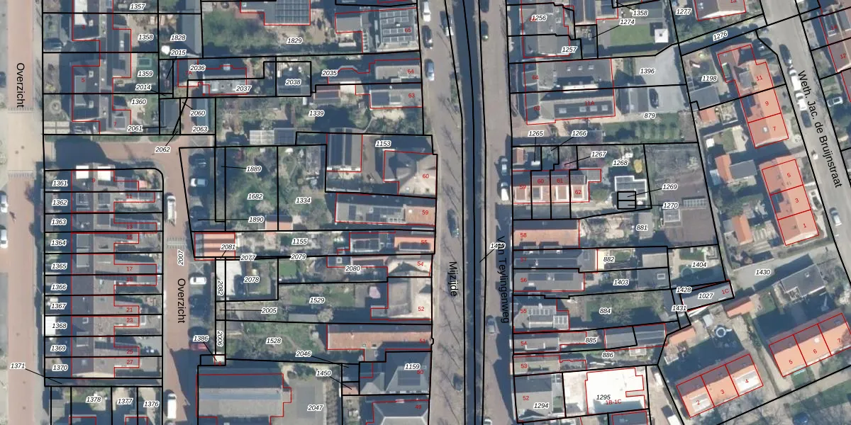 Het perceel waarop Mijzijde 59 staat heeft een oppervlakte van 456 m². Dit is een groot perceel. De perceeloppervlakte wordt geregistreerd door het Kadaster. Gedetailleerde informatie over de maten van dit perceel kunt u vinden in het rapport Kadastrale kaart met maatvoering van Mijzijde 59.