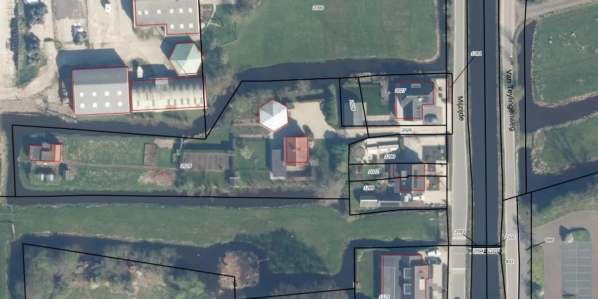 Het perceel waarop Mijzijde 92 staat heeft een oppervlakte van 3032 m². Dit is een zeer groot perceel. De perceeloppervlakte wordt geregistreerd door het Kadaster. Gedetailleerde informatie over de maten van dit perceel kunt u vinden in het rapport Kadastrale kaart met maatvoering van Mijzijde 92.