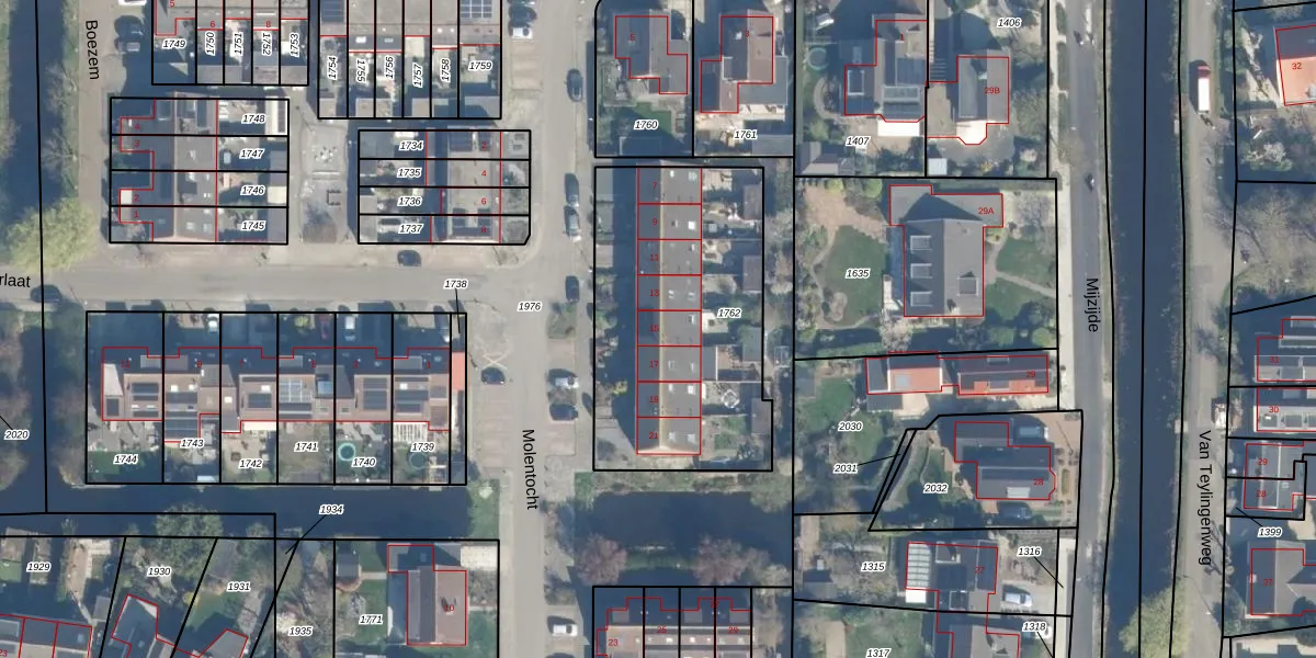 Het perceel waarop Molentocht 15 staat heeft een oppervlakte van 1195 m². Dit is een zeer groot perceel. De perceeloppervlakte wordt geregistreerd door het Kadaster. Gedetailleerde informatie over de maten van dit perceel kunt u vinden in het rapport Kadastrale kaart met maatvoering van Molentocht 15.