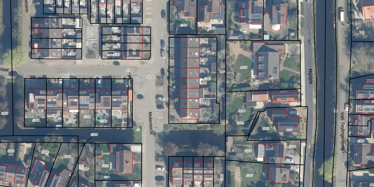 Het perceel waarop Molentocht 17 staat heeft een oppervlakte van 1195 m². Dit is een zeer groot perceel. De perceeloppervlakte wordt geregistreerd door het Kadaster. Gedetailleerde informatie over de maten van dit perceel kunt u vinden in het rapport Kadastrale kaart met maatvoering van Molentocht 17.