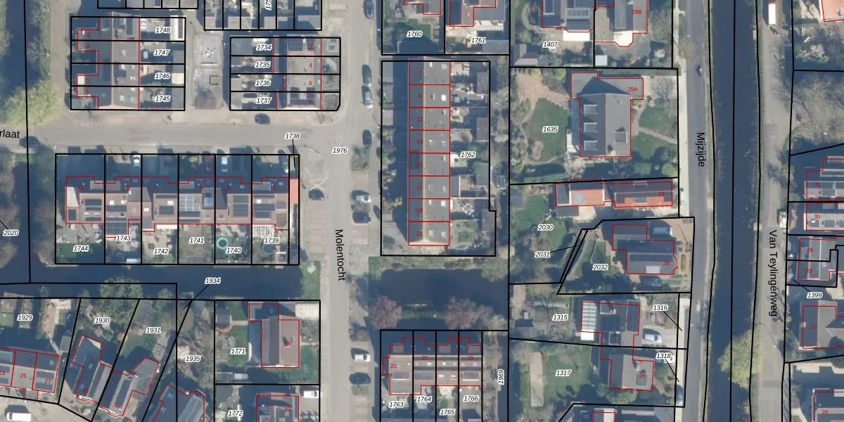 Het perceel waarop Molentocht 19 staat heeft een oppervlakte van 1195 m². Dit is een zeer groot perceel. De perceeloppervlakte wordt geregistreerd door het Kadaster. Gedetailleerde informatie over de maten van dit perceel kunt u vinden in het rapport Kadastrale kaart met maatvoering van Molentocht 19.