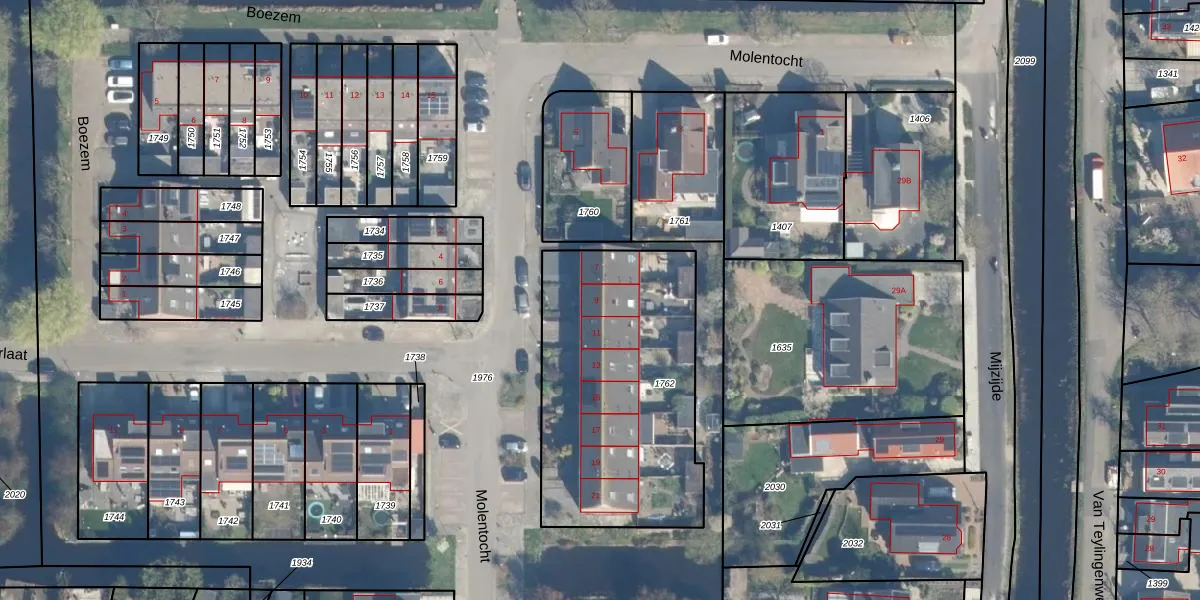 Het perceel waarop Molentocht 9 staat heeft een oppervlakte van 1195 m². Dit is een zeer groot perceel. De perceeloppervlakte wordt geregistreerd door het Kadaster. Gedetailleerde informatie over de maten van dit perceel kunt u vinden in het rapport Kadastrale kaart met maatvoering van Molentocht 9.