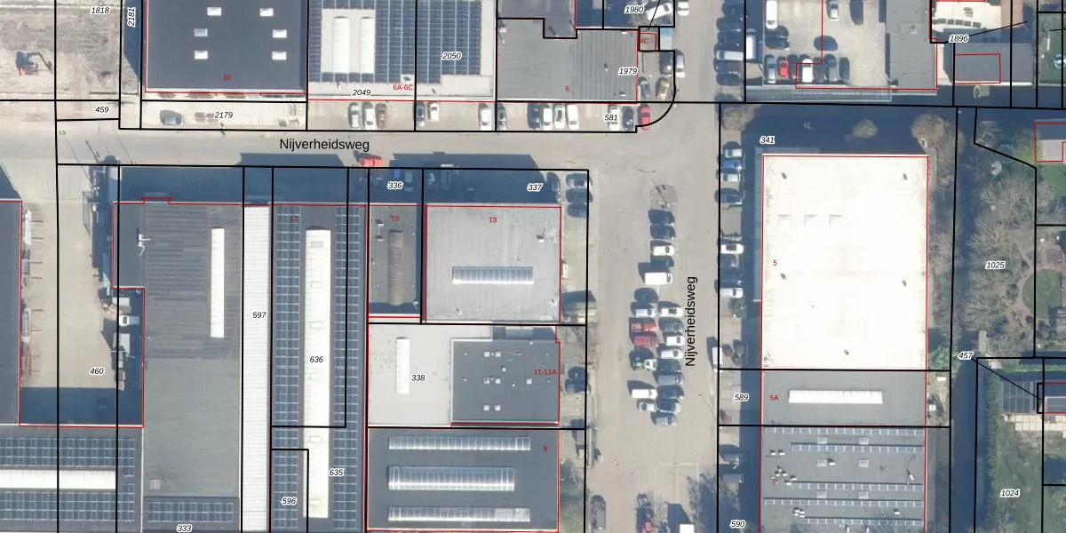 Het perceel waarop Nijverheidsweg 13 staat heeft een oppervlakte van 905 m². Dit is een groot perceel. De perceeloppervlakte wordt geregistreerd door het Kadaster. Gedetailleerde informatie over de maten van dit perceel kunt u vinden in het rapport Kadastrale kaart met maatvoering van Nijverheidsweg 13.