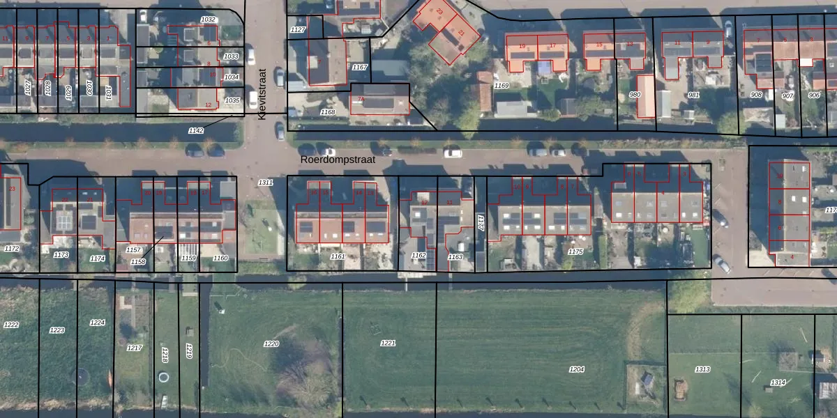 Roerdompstraat 12 is gelegen op kadastraal perceel KMR00E1162. Deze kadastrale aanduiding is uniek en wordt gebruikt door het Kadaster om eigendomsrechten en andere zakelijke rechten vast te leggen. Het perceel maakt onderdeel uit van de kadastrale gemeente Kamerik.