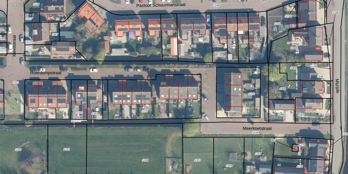 Het perceel waarop Roerdompstraat 5 staat heeft een oppervlakte van 1285 m². Dit is een zeer groot perceel. De perceeloppervlakte wordt geregistreerd door het Kadaster. Gedetailleerde informatie over de maten van dit perceel kunt u vinden in het rapport Kadastrale kaart met maatvoering van Roerdompstraat 5.