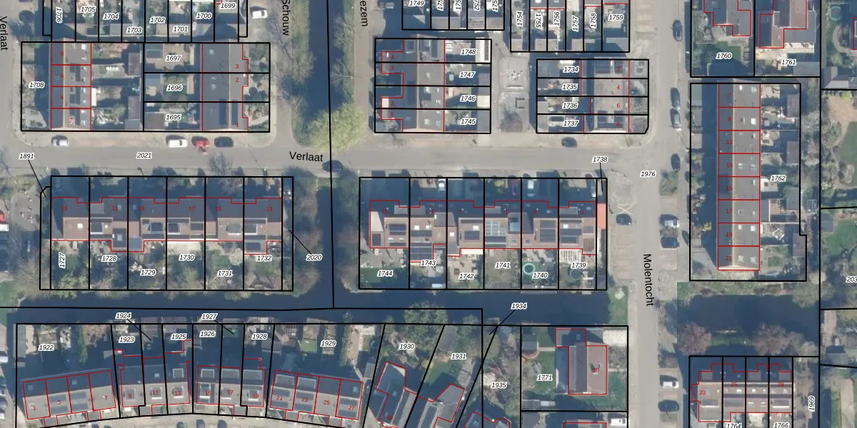 Het perceel waarop Verlaat 9 staat heeft een oppervlakte van 227 m². Dit is een middelgroot perceel. De perceeloppervlakte wordt geregistreerd door het Kadaster. Gedetailleerde informatie over de maten van dit perceel kunt u vinden in het rapport Kadastrale kaart met maatvoering van Verlaat 9.