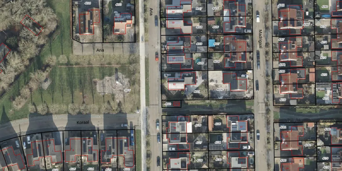 Het perceel waarop Aria 62 staat heeft een oppervlakte van 464 m². Dit is een groot perceel. De perceeloppervlakte wordt geregistreerd door het Kadaster. Gedetailleerde informatie over de maten van dit perceel kunt u vinden in het rapport Kadastrale kaart met maatvoering van Aria 62.
