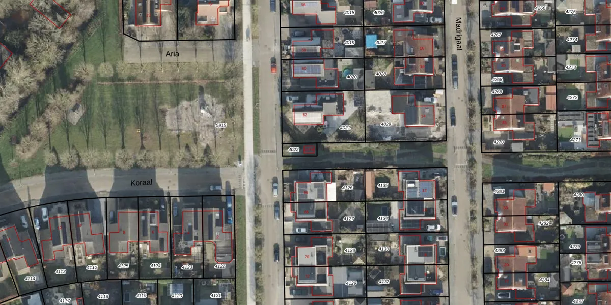 Het perceel waarop Aria 62-TR staat heeft een oppervlakte van 48 m². Dit is een klein perceel. De perceeloppervlakte wordt geregistreerd door het Kadaster. Gedetailleerde informatie over de maten van dit perceel kunt u vinden in het rapport Kadastrale kaart met maatvoering van Aria 62-TR.
