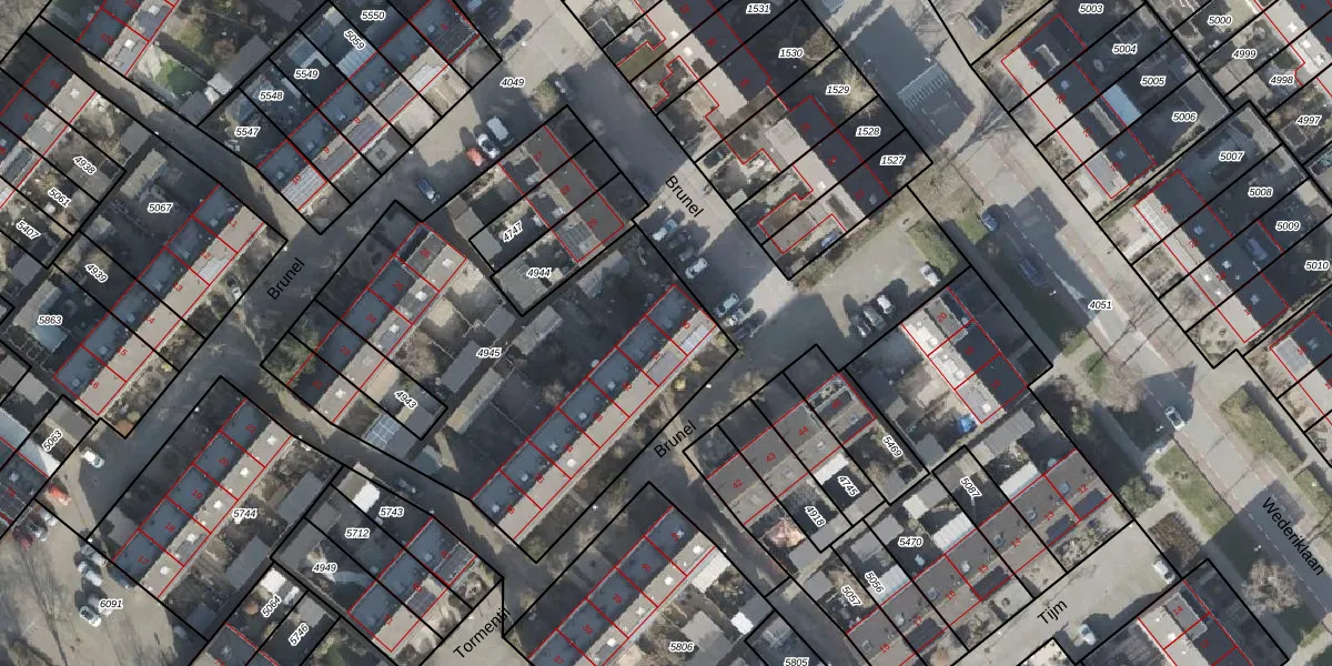 Het perceel waarop Brunel 30 staat heeft een oppervlakte van 2035 m². Dit is een zeer groot perceel. De perceeloppervlakte wordt geregistreerd door het Kadaster. Gedetailleerde informatie over de maten van dit perceel kunt u vinden in het rapport Kadastrale kaart met maatvoering van Brunel 30.