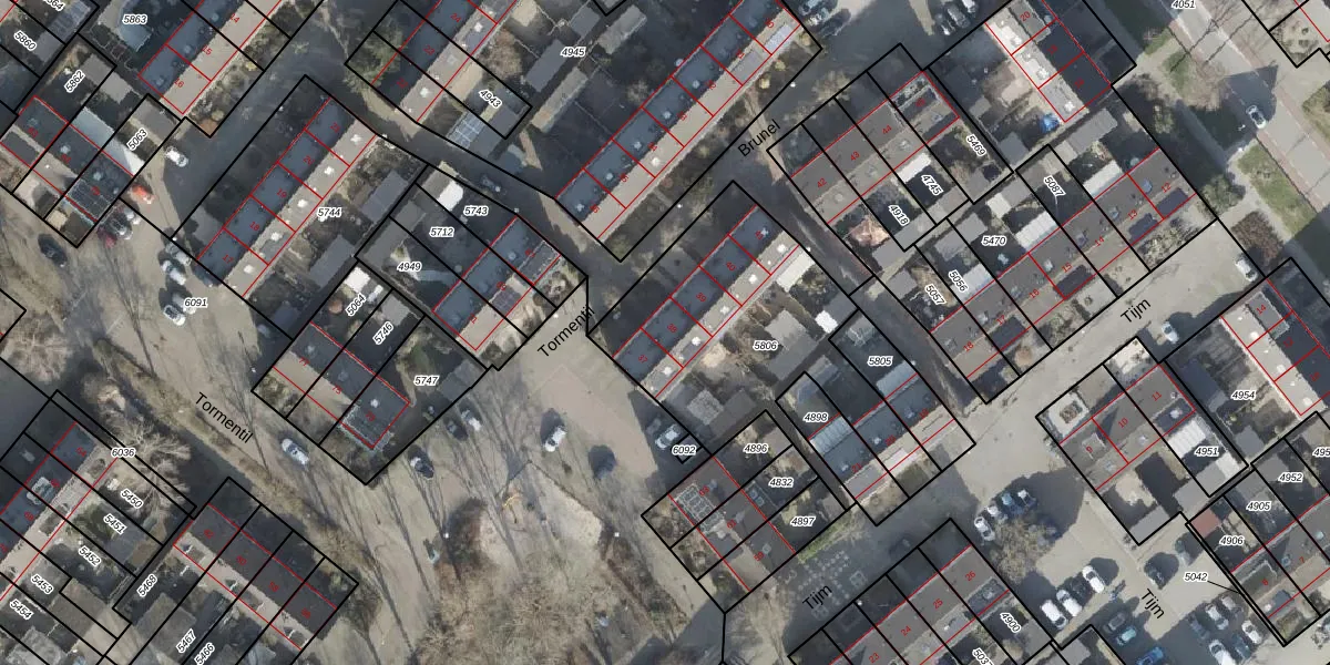 Het perceel waarop Brunel 38 staat heeft een oppervlakte van 1054 m². Dit is een zeer groot perceel. De perceeloppervlakte wordt geregistreerd door het Kadaster. Gedetailleerde informatie over de maten van dit perceel kunt u vinden in het rapport Kadastrale kaart met maatvoering van Brunel 38.
