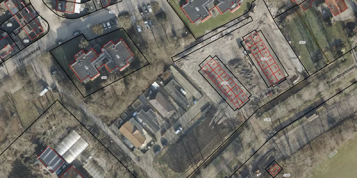 Het perceel waarop Buitenbroeksweg 1-A staat heeft een oppervlakte van 4,3 ha. Dit is een zeer groot perceel. De perceeloppervlakte wordt geregistreerd door het Kadaster. Gedetailleerde informatie over de maten van dit perceel kunt u vinden in het rapport Kadastrale kaart met maatvoering van Buitenbroeksweg 1-A.