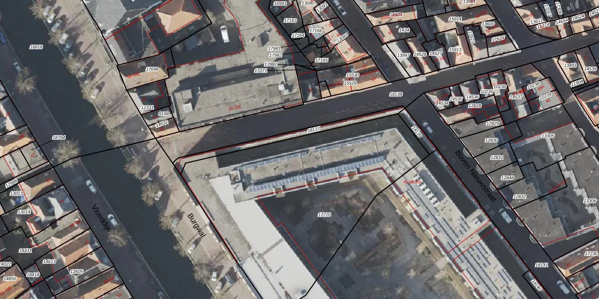 Het perceel waarop Burgwal 45-104 staat heeft een oppervlakte van 2784 m². Dit is een zeer groot perceel. De perceeloppervlakte wordt geregistreerd door het Kadaster. Gedetailleerde informatie over de maten van dit perceel kunt u vinden in het rapport Kadastrale kaart met maatvoering van Burgwal 45-104.