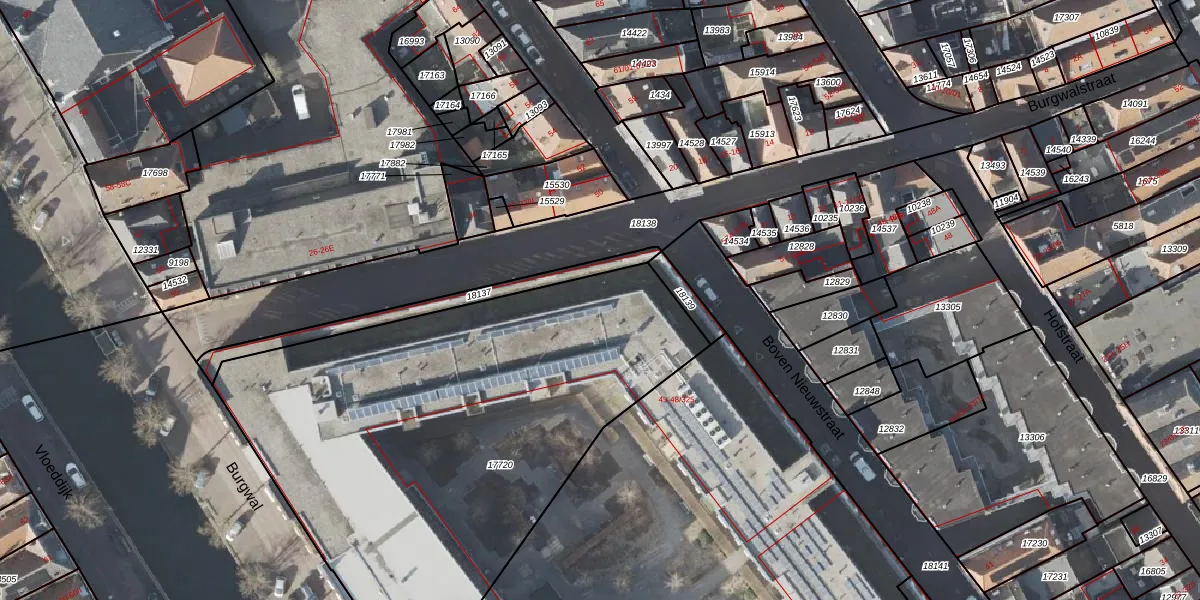 Het perceel waarop Burgwal 45-108 staat heeft een oppervlakte van 2784 m². Dit is een zeer groot perceel. De perceeloppervlakte wordt geregistreerd door het Kadaster. Gedetailleerde informatie over de maten van dit perceel kunt u vinden in het rapport Kadastrale kaart met maatvoering van Burgwal 45-108.
