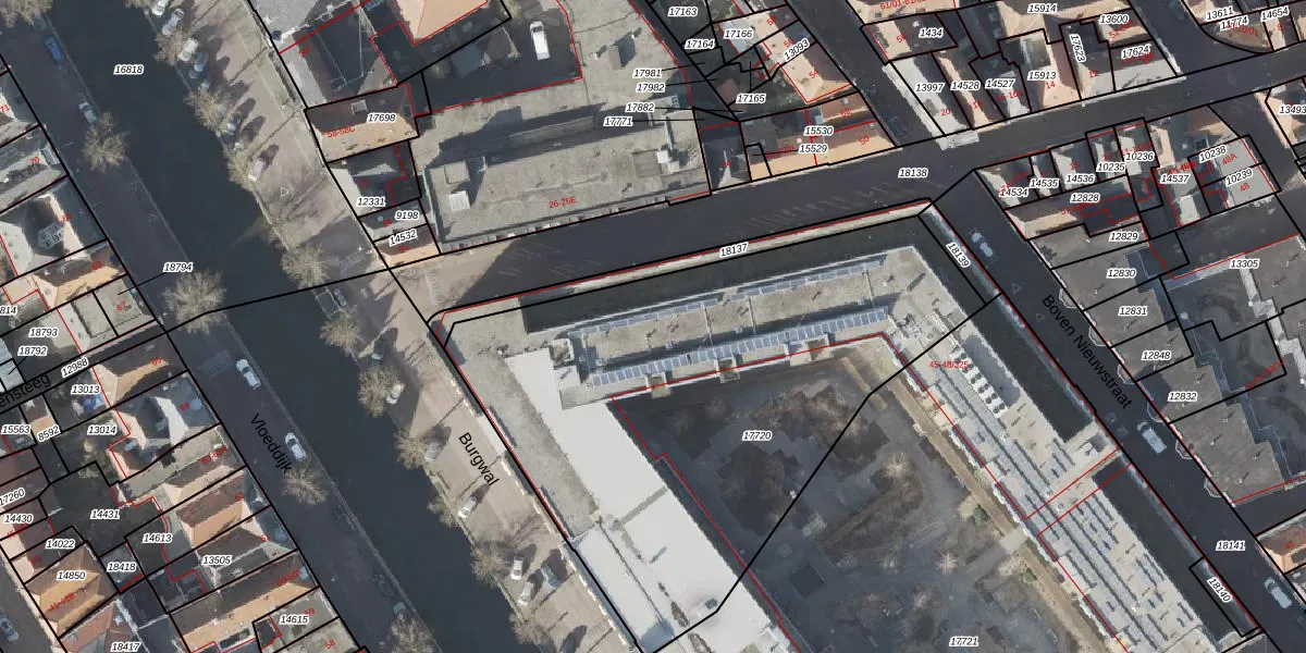 Het perceel waarop Burgwal 45-116 staat heeft een oppervlakte van 2784 m². Dit is een zeer groot perceel. De perceeloppervlakte wordt geregistreerd door het Kadaster. Gedetailleerde informatie over de maten van dit perceel kunt u vinden in het rapport Kadastrale kaart met maatvoering van Burgwal 45-116.