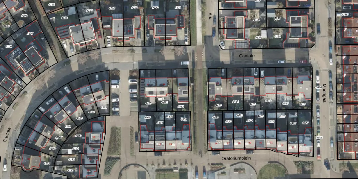 Het perceel waarop Cantate 51 staat heeft een oppervlakte van 216 m². Dit is een middelgroot perceel. De perceeloppervlakte wordt geregistreerd door het Kadaster. Gedetailleerde informatie over de maten van dit perceel kunt u vinden in het rapport Kadastrale kaart met maatvoering van Cantate 51.