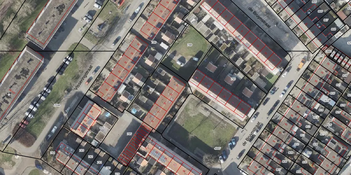 Het perceel waarop de Bruynstraat 31 staat heeft een oppervlakte van 790 m². Dit is een groot perceel. De perceeloppervlakte wordt geregistreerd door het Kadaster. Gedetailleerde informatie over de maten van dit perceel kunt u vinden in het rapport Kadastrale kaart met maatvoering van de Bruynstraat 31.