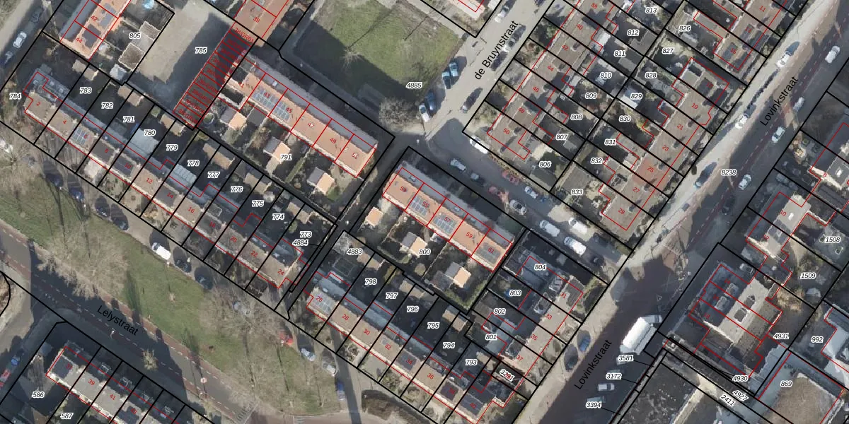 Het perceel waarop de Bruynstraat 55 staat heeft een oppervlakte van 856 m². Dit is een groot perceel. De perceeloppervlakte wordt geregistreerd door het Kadaster. Gedetailleerde informatie over de maten van dit perceel kunt u vinden in het rapport Kadastrale kaart met maatvoering van de Bruynstraat 55.