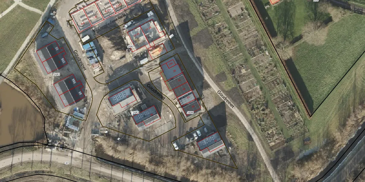 Het perceel waarop Goudreinet 22 staat heeft een oppervlakte van 1046 m². Dit is een zeer groot perceel. De perceeloppervlakte wordt geregistreerd door het Kadaster. Gedetailleerde informatie over de maten van dit perceel kunt u vinden in het rapport Kadastrale kaart met maatvoering van Goudreinet 22.