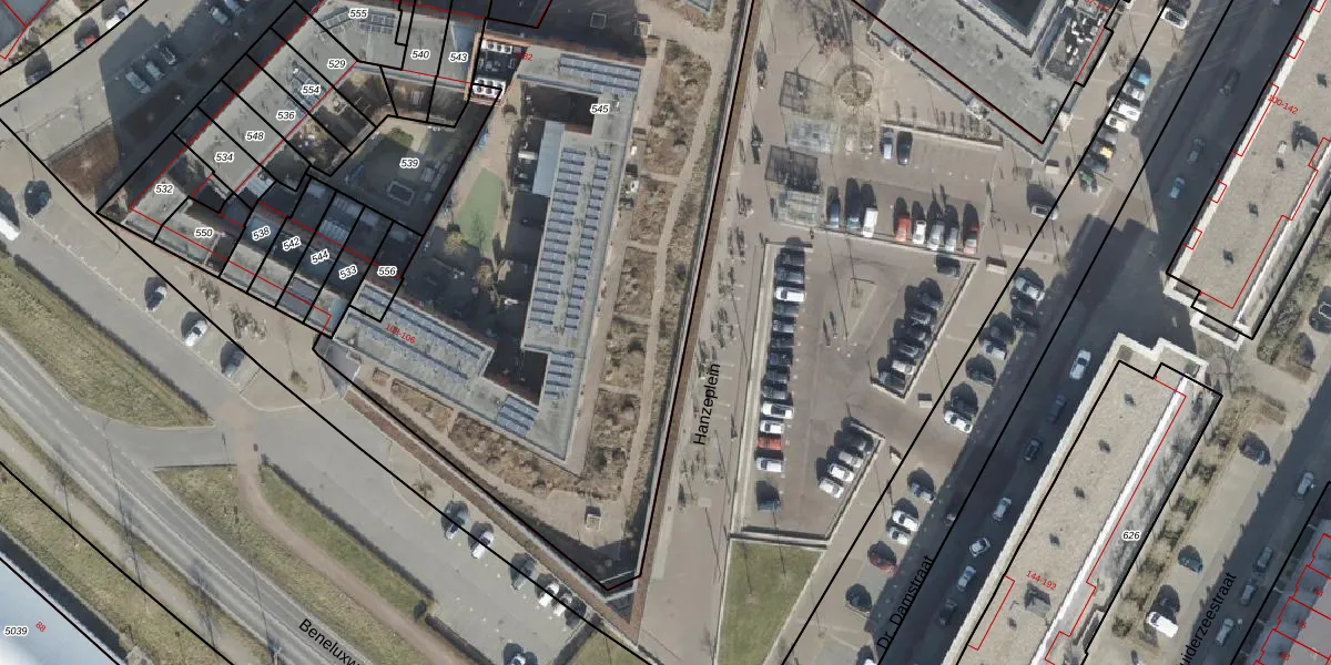 Het perceel waarop Hanzeplein 29 staat heeft een oppervlakte van 5045 m². Dit is een zeer groot perceel. De perceeloppervlakte wordt geregistreerd door het Kadaster. Gedetailleerde informatie over de maten van dit perceel kunt u vinden in het rapport Kadastrale kaart met maatvoering van Hanzeplein 29.
