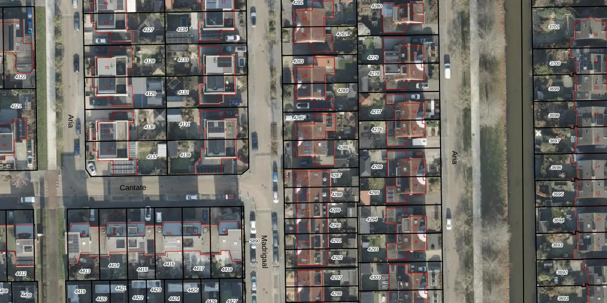 Het perceel waarop Madrigaal 23 staat heeft een oppervlakte van 233 m². Dit is een middelgroot perceel. De perceeloppervlakte wordt geregistreerd door het Kadaster. Gedetailleerde informatie over de maten van dit perceel kunt u vinden in het rapport Kadastrale kaart met maatvoering van Madrigaal 23.