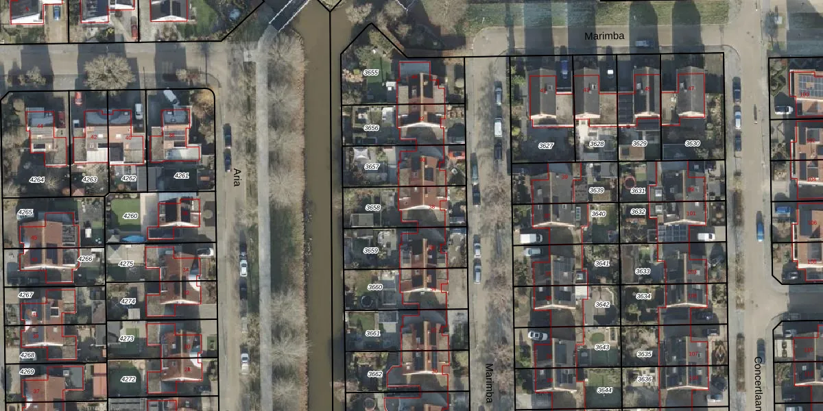 Het perceel waarop Marimba 38 staat heeft een oppervlakte van 301 m². Dit is een groot perceel. De perceeloppervlakte wordt geregistreerd door het Kadaster. Gedetailleerde informatie over de maten van dit perceel kunt u vinden in het rapport Kadastrale kaart met maatvoering van Marimba 38.