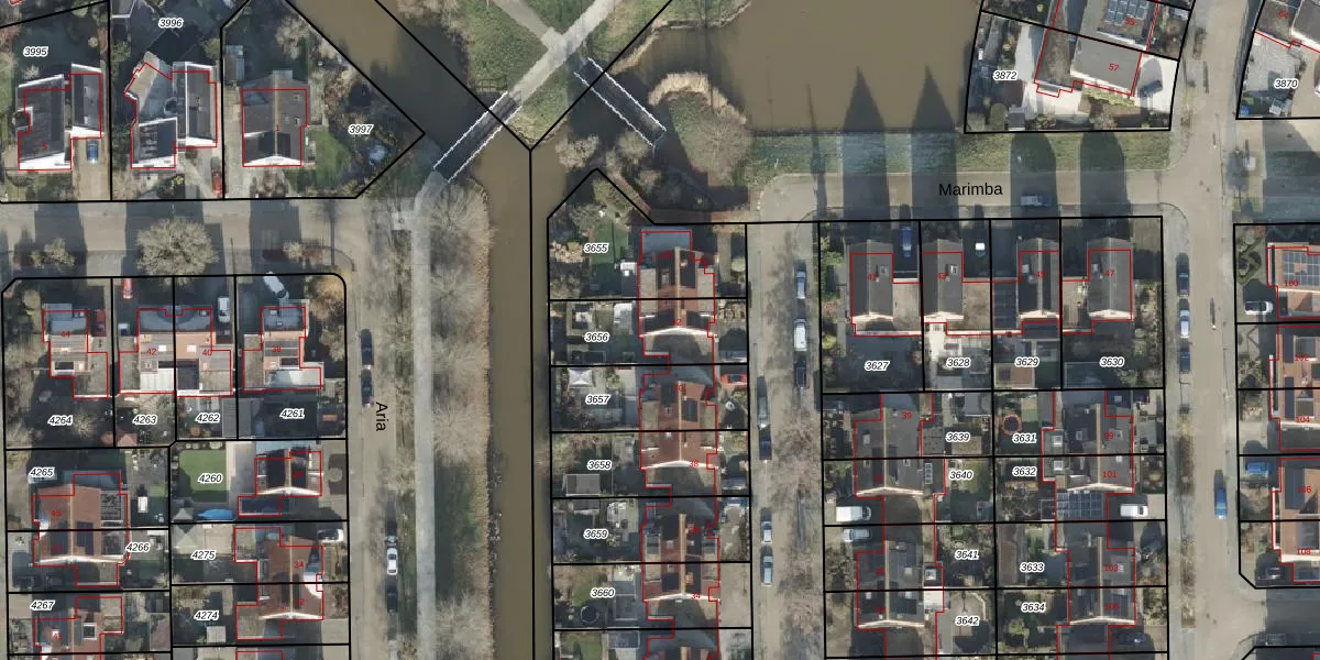 Het perceel waarop Marimba 42 staat heeft een oppervlakte van 300 m². Dit is een groot perceel. De perceeloppervlakte wordt geregistreerd door het Kadaster. Gedetailleerde informatie over de maten van dit perceel kunt u vinden in het rapport Kadastrale kaart met maatvoering van Marimba 42.