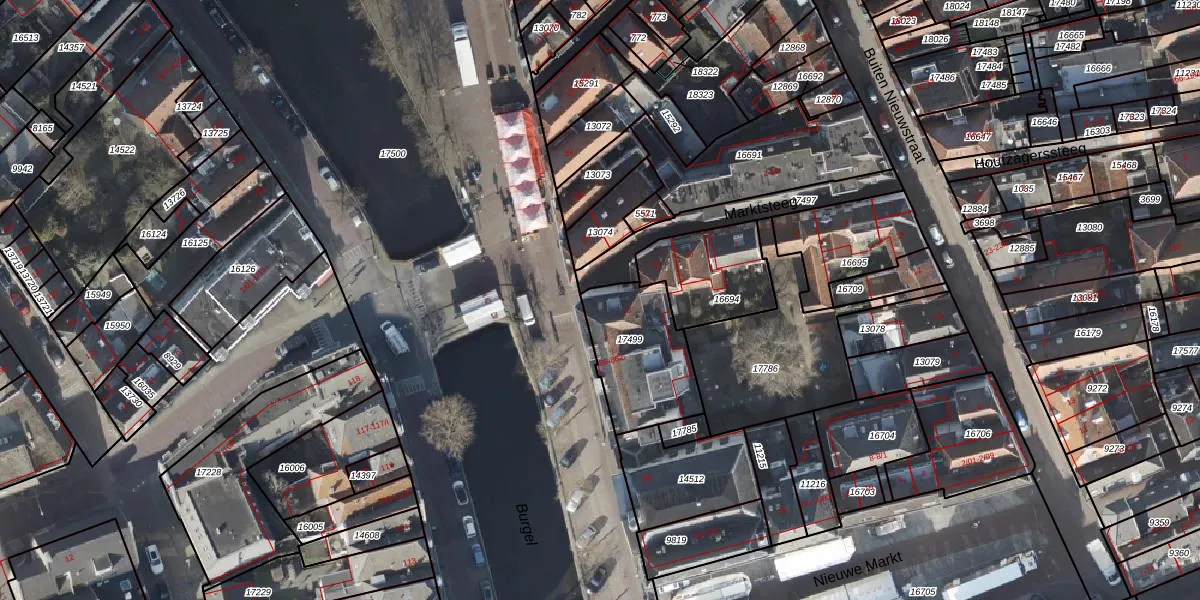 Het perceel waarop Marktsteeg 13 staat heeft een oppervlakte van 357 m². Dit is een groot perceel. De perceeloppervlakte wordt geregistreerd door het Kadaster. Gedetailleerde informatie over de maten van dit perceel kunt u vinden in het rapport Kadastrale kaart met maatvoering van Marktsteeg 13.