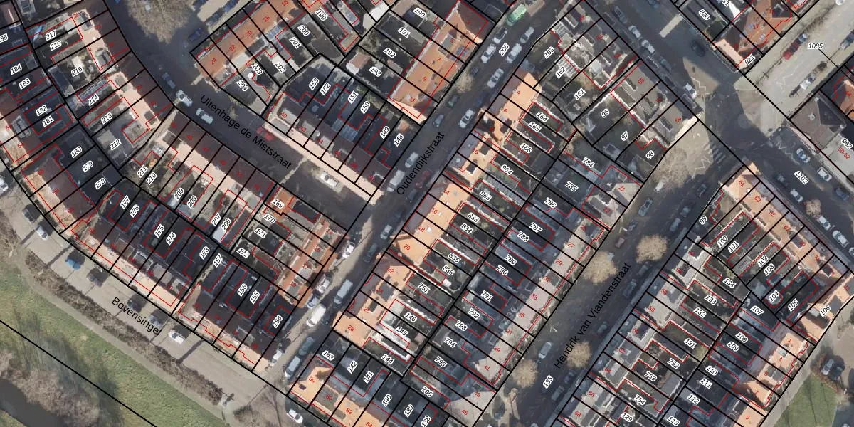 Het perceel waarop Oudendijkstraat 16 staat heeft een oppervlakte van 104 m². Dit is een middelgroot perceel. De perceeloppervlakte wordt geregistreerd door het Kadaster. Gedetailleerde informatie over de maten van dit perceel kunt u vinden in het rapport Kadastrale kaart met maatvoering van Oudendijkstraat 16.