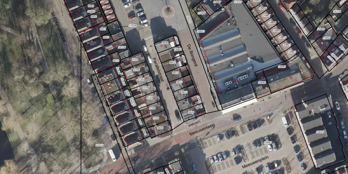 Gebruik de zoekbalk of klik op een perceel voor informatie over de adressen binnen dit perceel.