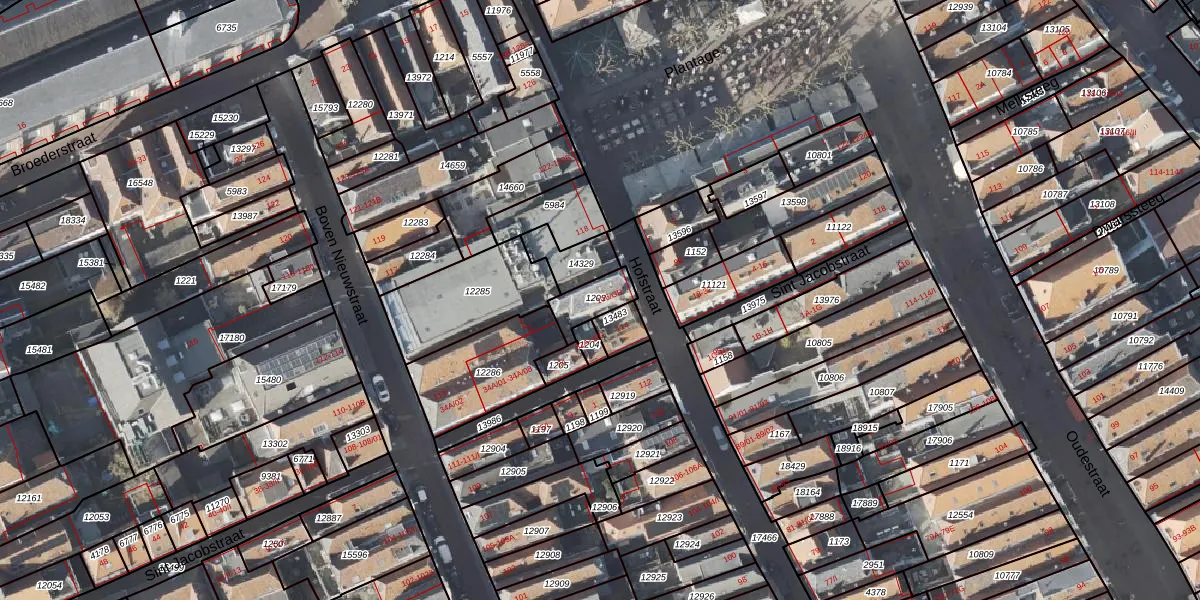 Het perceel waarop Sint Jacobstraat 32-D staat heeft een oppervlakte van 78 m². Dit is een klein perceel. De perceeloppervlakte wordt geregistreerd door het Kadaster. Gedetailleerde informatie over de maten van dit perceel kunt u vinden in het rapport Kadastrale kaart met maatvoering van Sint Jacobstraat 32-D.