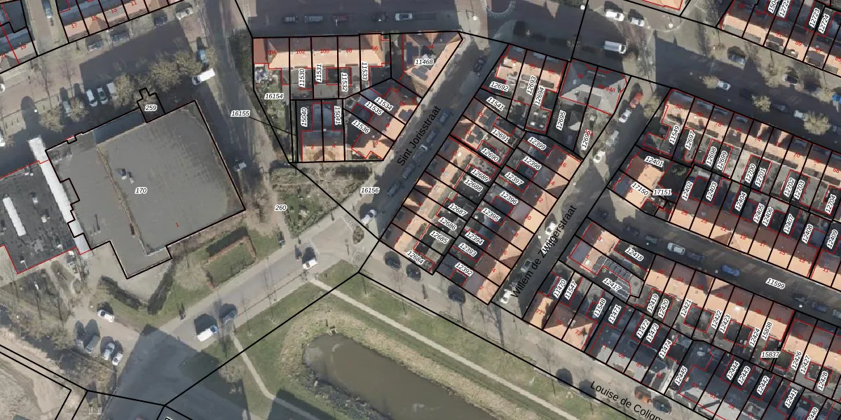 Het perceel waarop Sint Jorisstraat 5 staat heeft een oppervlakte van 74 m². Dit is een klein perceel. De perceeloppervlakte wordt geregistreerd door het Kadaster. Gedetailleerde informatie over de maten van dit perceel kunt u vinden in het rapport Kadastrale kaart met maatvoering van Sint Jorisstraat 5.