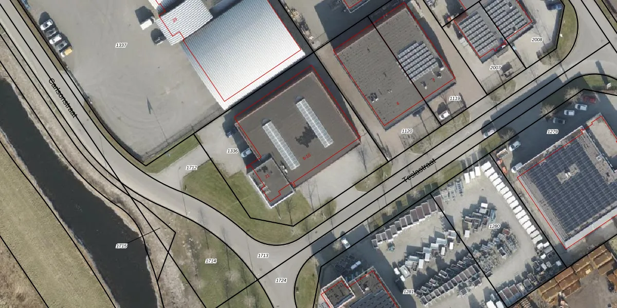 Het perceel waarop Teslastraat 10 staat heeft een oppervlakte van 1976 m². Dit is een zeer groot perceel. De perceeloppervlakte wordt geregistreerd door het Kadaster. Gedetailleerde informatie over de maten van dit perceel kunt u vinden in het rapport Kadastrale kaart met maatvoering van Teslastraat 10.