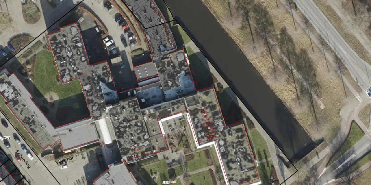 Het perceel waarop Vijverhof 174 staat heeft een oppervlakte van 1,4 ha. Dit is een zeer groot perceel. De perceeloppervlakte wordt geregistreerd door het Kadaster. Gedetailleerde informatie over de maten van dit perceel kunt u vinden in het rapport Kadastrale kaart met maatvoering van Vijverhof 174.
